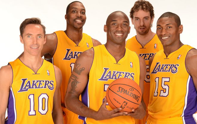 而作为NBA历史上的豪门球队,湖人队史上没少组建豪华阵容,比如00年代的初代F4,那套阵容里除了奥尼尔和科比之外,球队还找来了卡尔马龙和佩顿,但由于球队当时深陷更衣室矛盾,再加上核心球员因年龄和伤病的下滑,最终他们也是遗憾没能夺冠。而在之后,到了2012年湖人又组建起了新一代的F4,当时的他们在拥有着科比、加索尔的情况下还搞来了霍华德、纳什。
