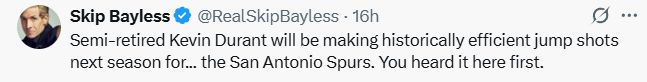 他表示:“半退休状态的杜兰特下赛季将为马刺队投出历史级效率的跳投,你们在这里最先听到这个消息。”