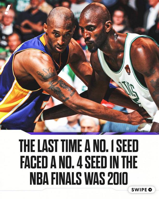 直播吧6月4日讯 今年的总决赛对阵双方雷霆和步行者,分别是各自赛区的第一和第四。而上一次出现战绩第一对阵战绩第四的总决赛还要追溯到15年前的湖人打凯尔特人。