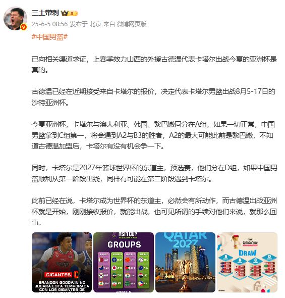 著名媒体人“三土带刺”在6月5日上午8:56给出确切消息,上赛季效力于山西男篮的强力外援古德温被卡塔尔男篮归化成功,他将代表卡塔尔队出战亚洲杯!而中国男篮在亚洲杯的比赛中,大概率会在第二阶段碰上卡塔尔队的。这对于中国男篮来说,未必是什么好消息,在古德温的带领下,卡塔尔队恐怕要阻挡中国男篮冲击亚洲杯冠军之路了。