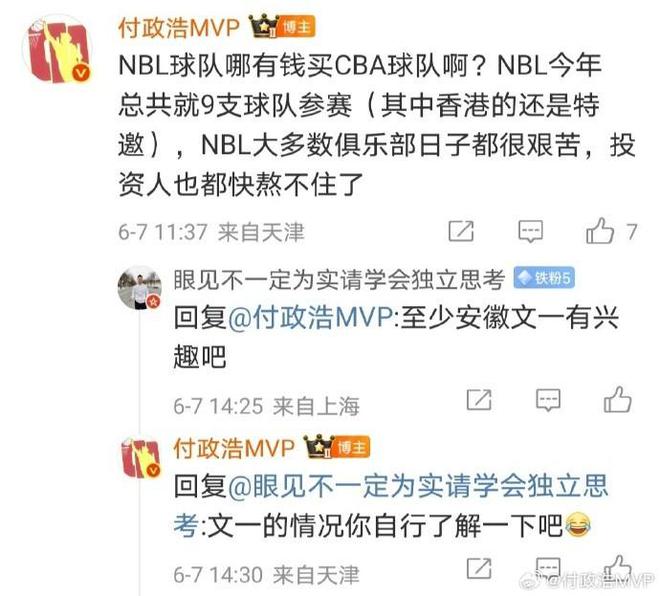 直播吧6月10日讯 今天,媒体人付政浩在社媒上谈到了NBL俱乐部安徽文一,表示这支球队这两天被传出解散的传闻。