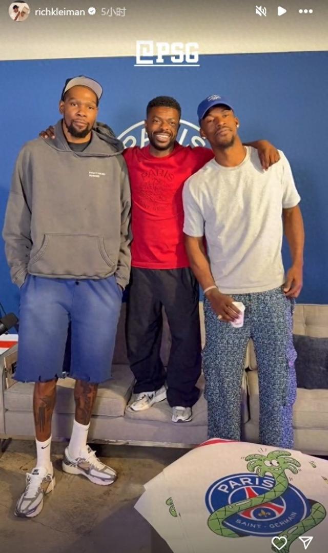 直播吧6月15日讯 今天,杜兰特的商业伙伴Rich Kleiman在INS分享了杜兰特和巴特勒的合影,他们出现在洛杉矶的PSG球场。