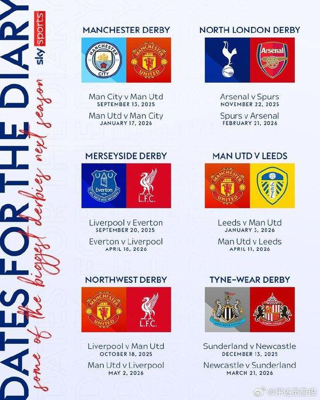 詹俊也在微博中写道:“新赛季英超赛程刚刚公布,随着利兹联和桑德兰重返英超,“玫瑰德比”与东北部“泰恩-威尔德比”将再现江湖。”