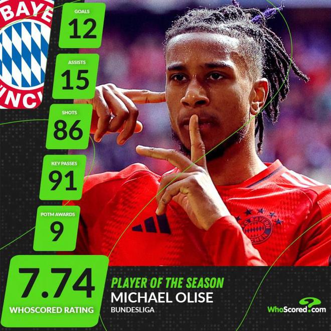 奥利塞本赛季为拜仁出战34场德甲比赛,打进12球,助攻15次,当选WhoScored德甲最佳球员。