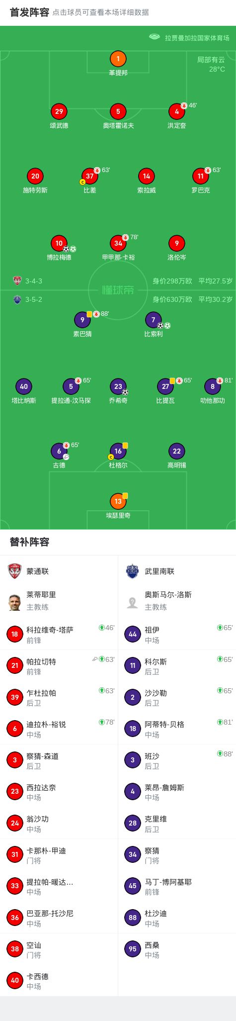 第45+4分钟,乔希奇手球送点,博拉梅德主罚命中,蒙通联1-2武里南联