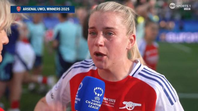 直播吧05月25日讯 阿森纳女足1比0力克巴萨女足夺冠,赛后阿森纳女足前锋鲁索眼含热泪接受了采访。